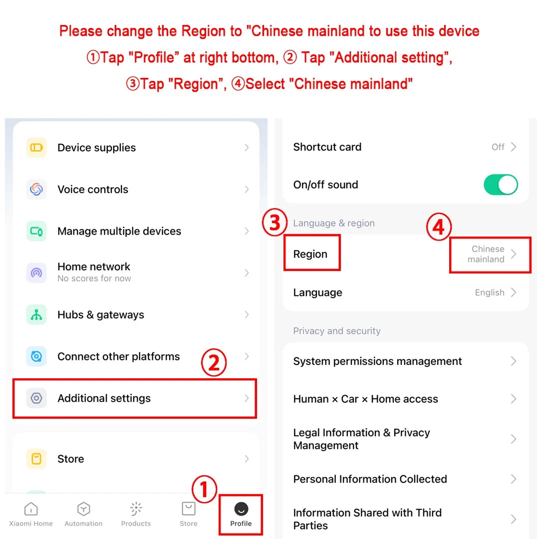 2.When connecting to Mijia APP, if you cannot connect, please switch the region to Chinese Mainland.