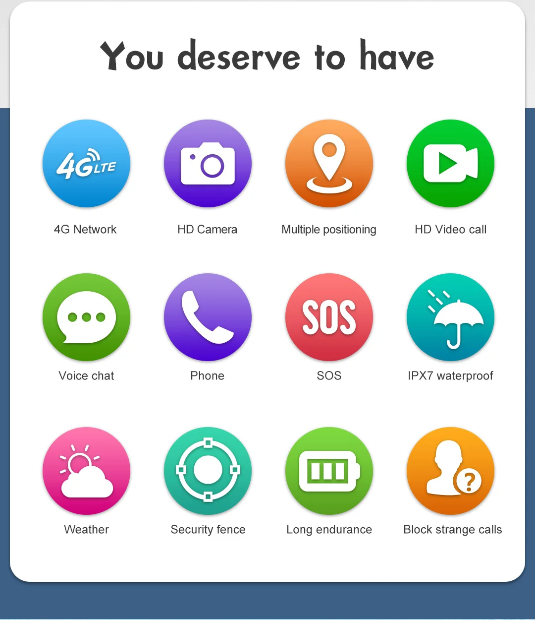 Location: GPS+AGPS+LBS+WIFI location, Geo-fence, Route playback Communication: SOS, 2-way phone call,Wechat, Video call, VOLTE; Health: Pedometer, Sleep monitor.