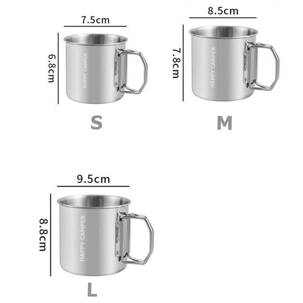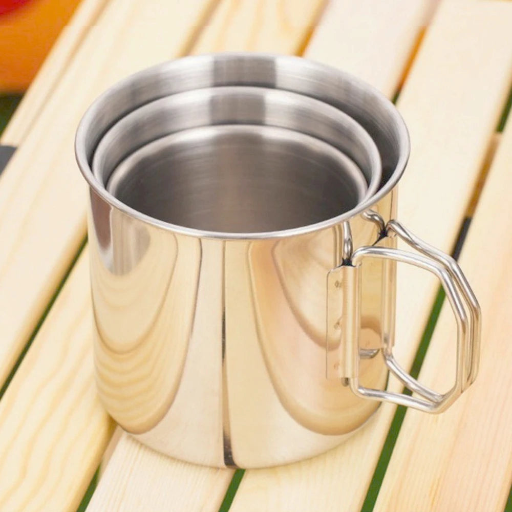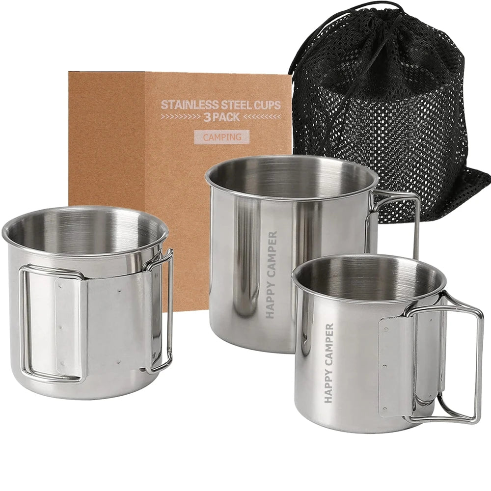 3Pcs Stackable Camping Mug Stainless Steel Portable Cups with Folding Handle Mesh Bag for Touring Trips Outdoor Camping Hiking