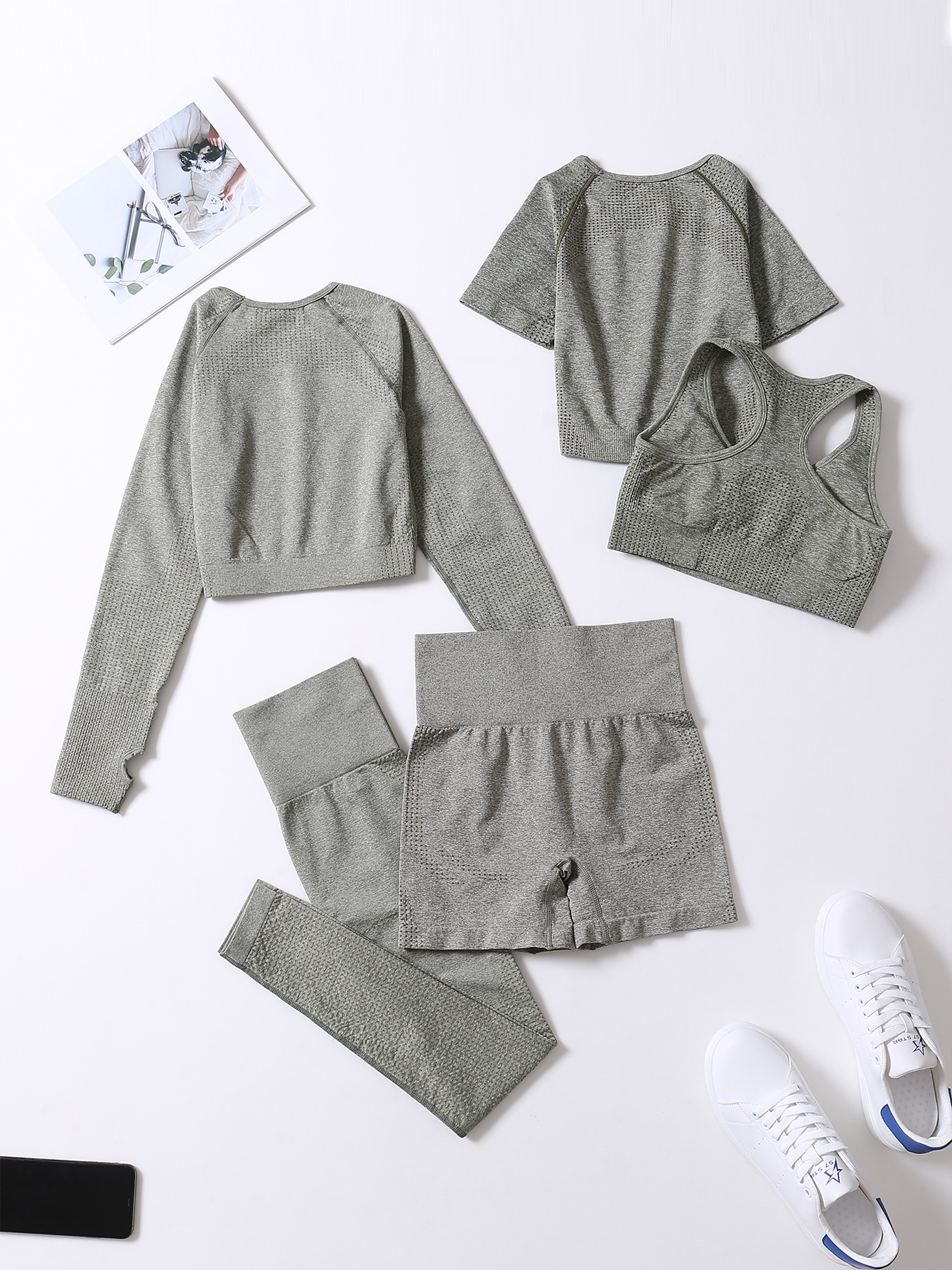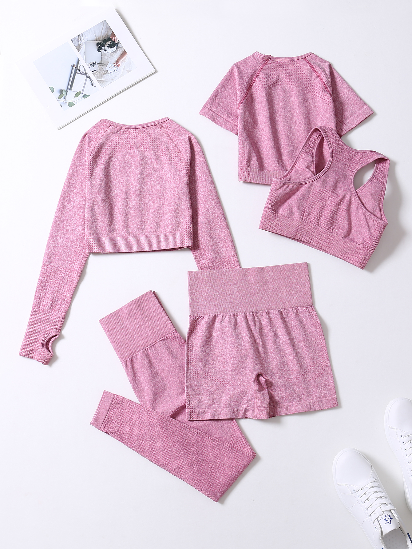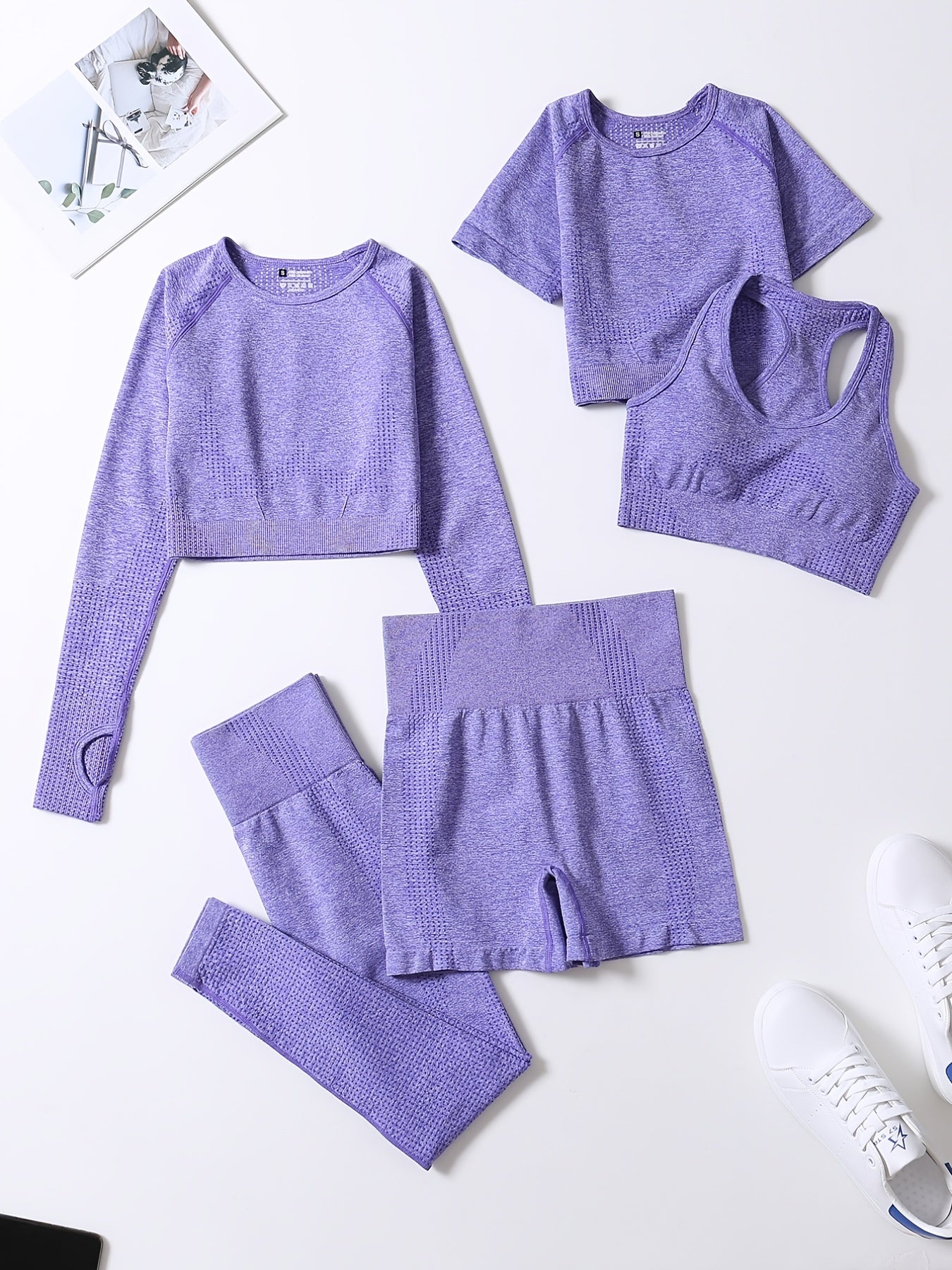 5pcs Seamless Yoga Suits, Racer Back Tank Top & Short Sleeve Cropped Top & Long Sleeve T Shirt & Shorts & Leggings Set, Women's Activewear