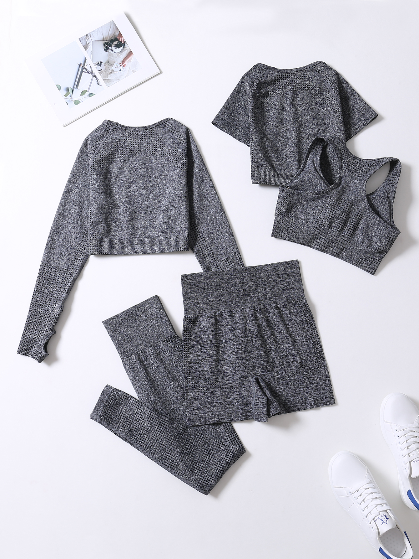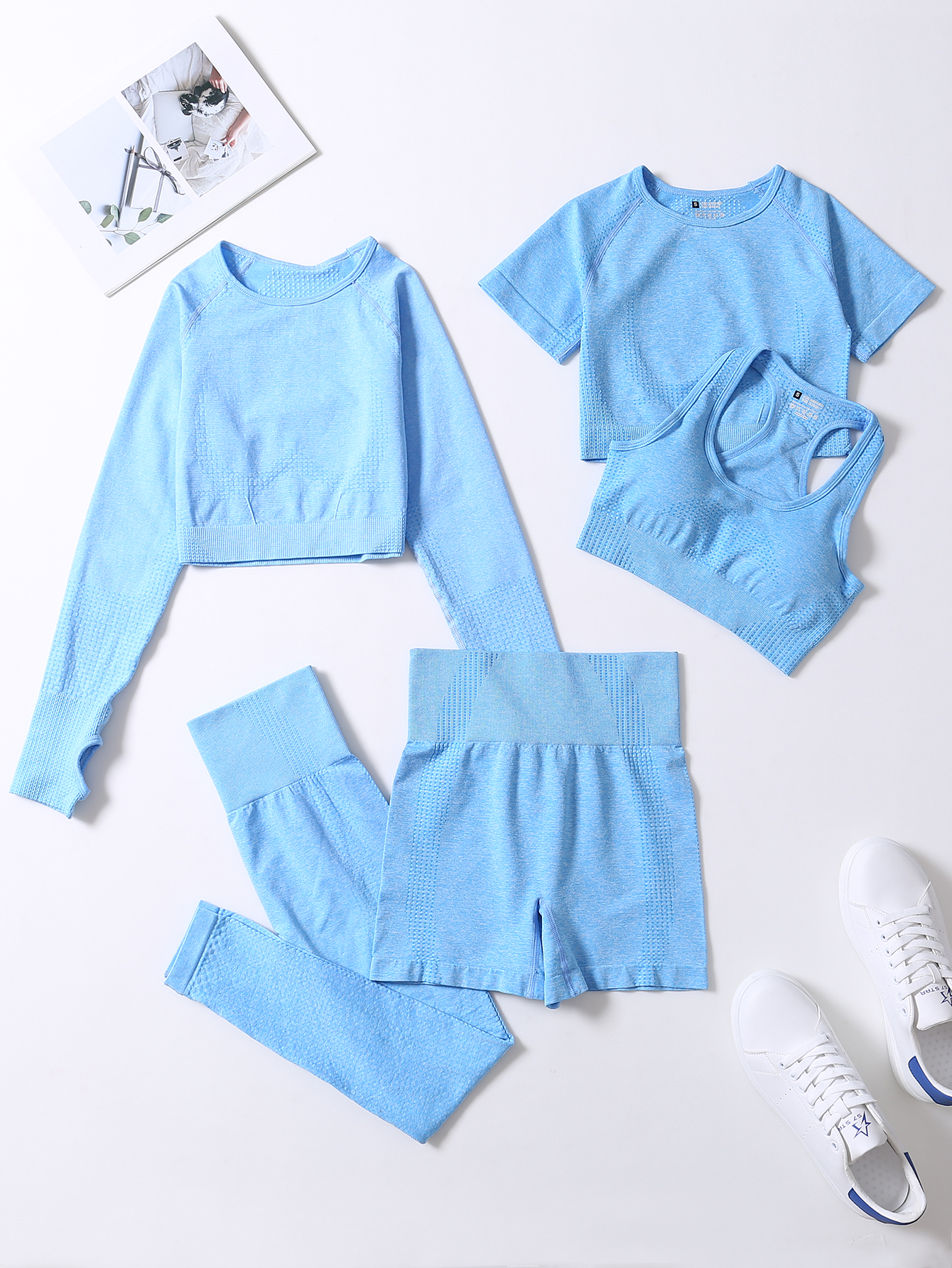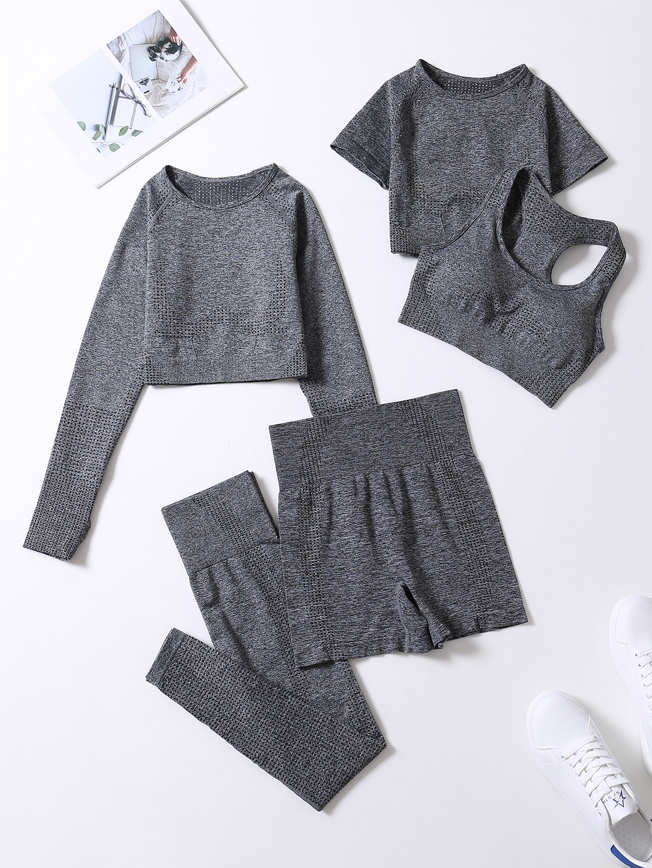 5pcs Seamless Yoga Suits, Racer Back Tank Top & Short Sleeve Cropped Top & Long Sleeve T Shirt & Shorts & Leggings Set, Women's Activewear