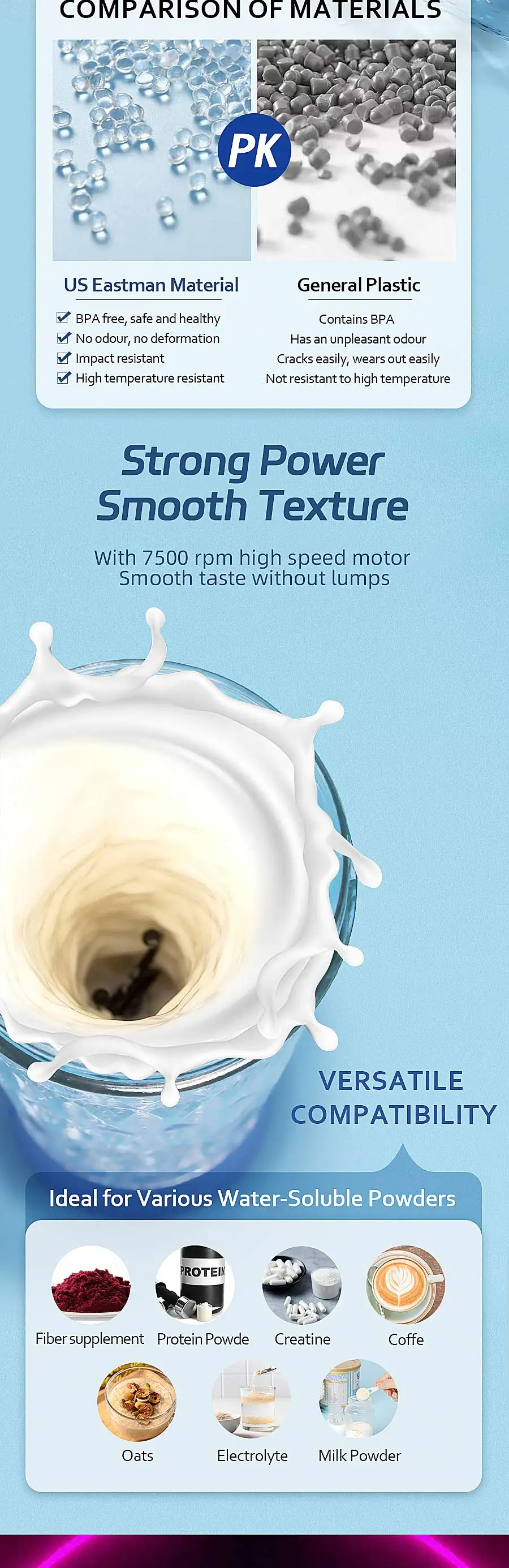 【Efficient Mixing, Say Goodbye to "Lumps"】 electric shaker bottle mix the protein powder evenly with strong motor power which spins at 7500rpm, ensuring smooth mixing with no lumpiness.The super mixing function does not need to worry about lumps that no longer dissolve in these drinks.