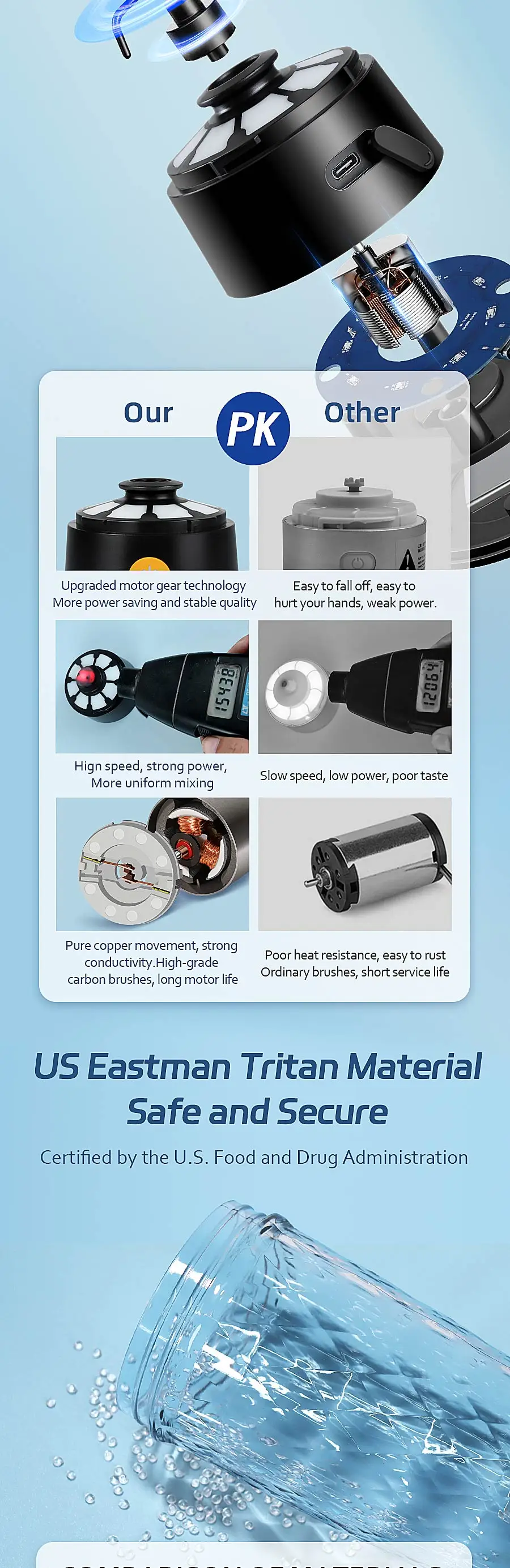 【Powerful Battery】In order to achieve more powerful mixing, our motors are a more efficient motors. The powerful motor ensures that there are no remaining blocks (the performance may be slightly reduced when the battery is low). Note: You need to long press 2 seconds to turn on the electric shaker bottle.