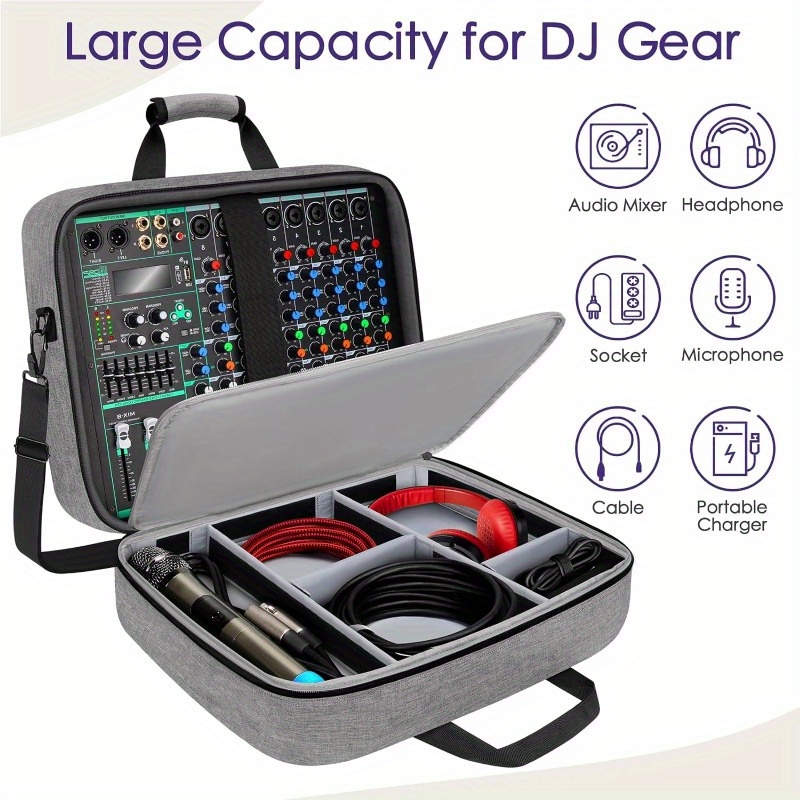 Designed to accommodate mixers measuring 15.5" x 13" x 6", this case is ideal for a variety of standard DJ and audio mixers, providing reliable protection. It features 10mm shock-resistant padding with a soft inner lining and thick cushioning to safeguard your equipment against impacts and falls. The compartments are adjustable, allowing you to arrange microphones, cables, adapters, and other accessories in a customized manner. Additionally, it is lightweight and easy to carry, equipped with comfortable handles and a removable strap for convenient transport.