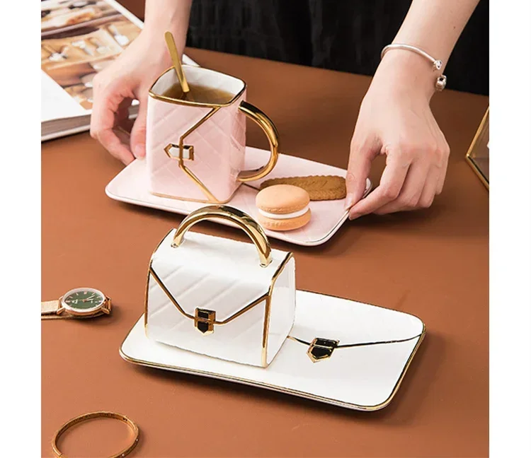 Handbag Shaped Mug Luruxy Coffee Cup Creative Tote Bag Shaped Cups Linner Saucer Set Dessert Afternoon Tea Mugs Drinkware Gifts