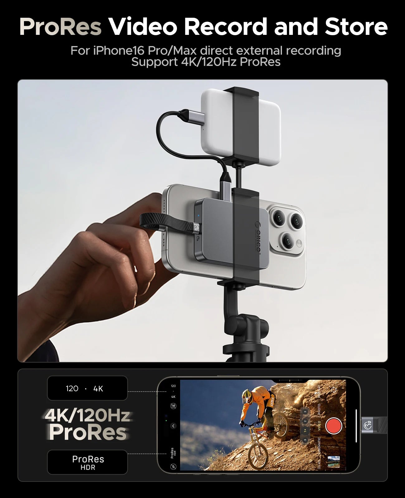 Seamlessly record and store 4K ProRes HDR videos directly from your iPhone 15/16 Pro/Pro Max. Edit directly from the SSD without the need for time-consuming file transfers.