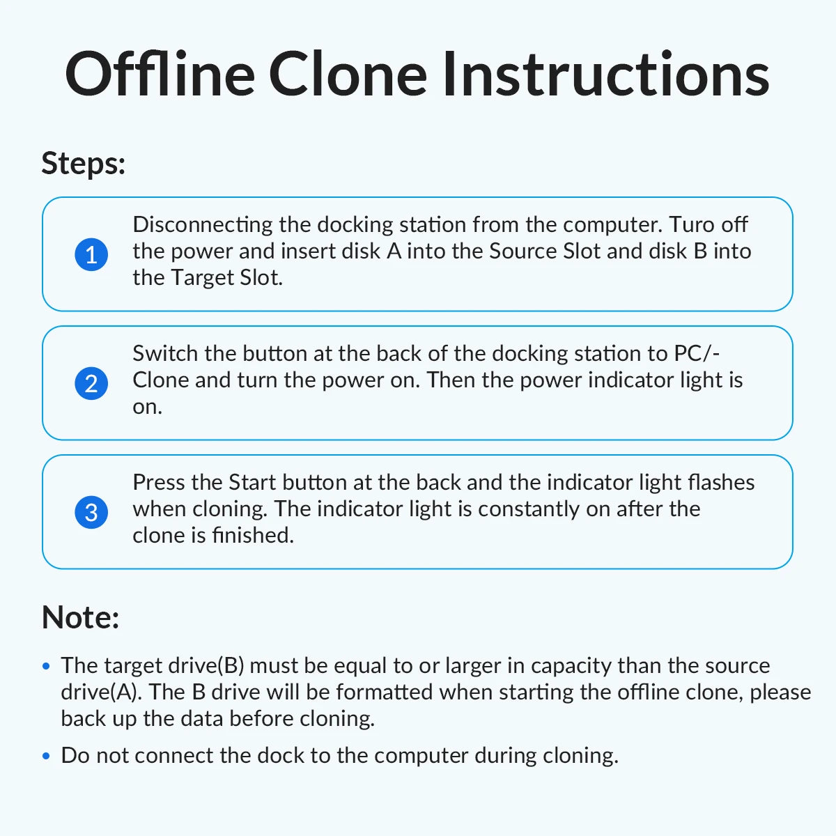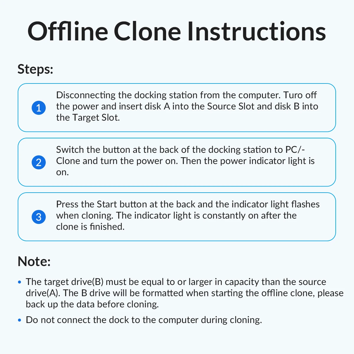 1.Please backup files in the target hard drive before cloning. Any files in target hard drive will be overwritten when offline cloning occurs, If the Target Disk Data is Still Useful, Please Use your Computer to Make a Backup First.
