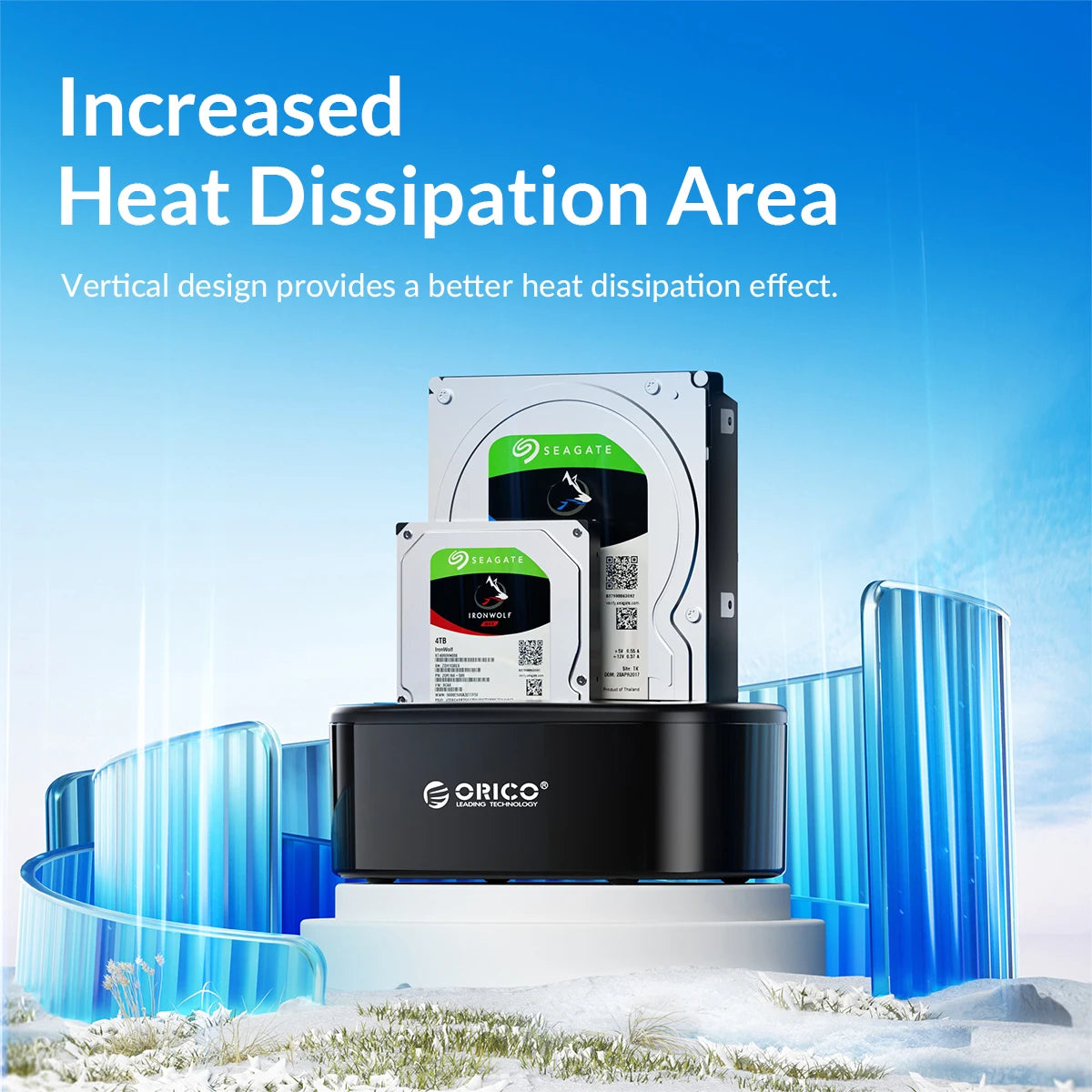 ORICO Dual-bay hard drive docking station.This docking station compatible with 2.5 inch or 3.5 inch HDD/SSD up to 16TB per bay, provide a more convenient way of transmitting data between your hard drive and computer through an available USB port.