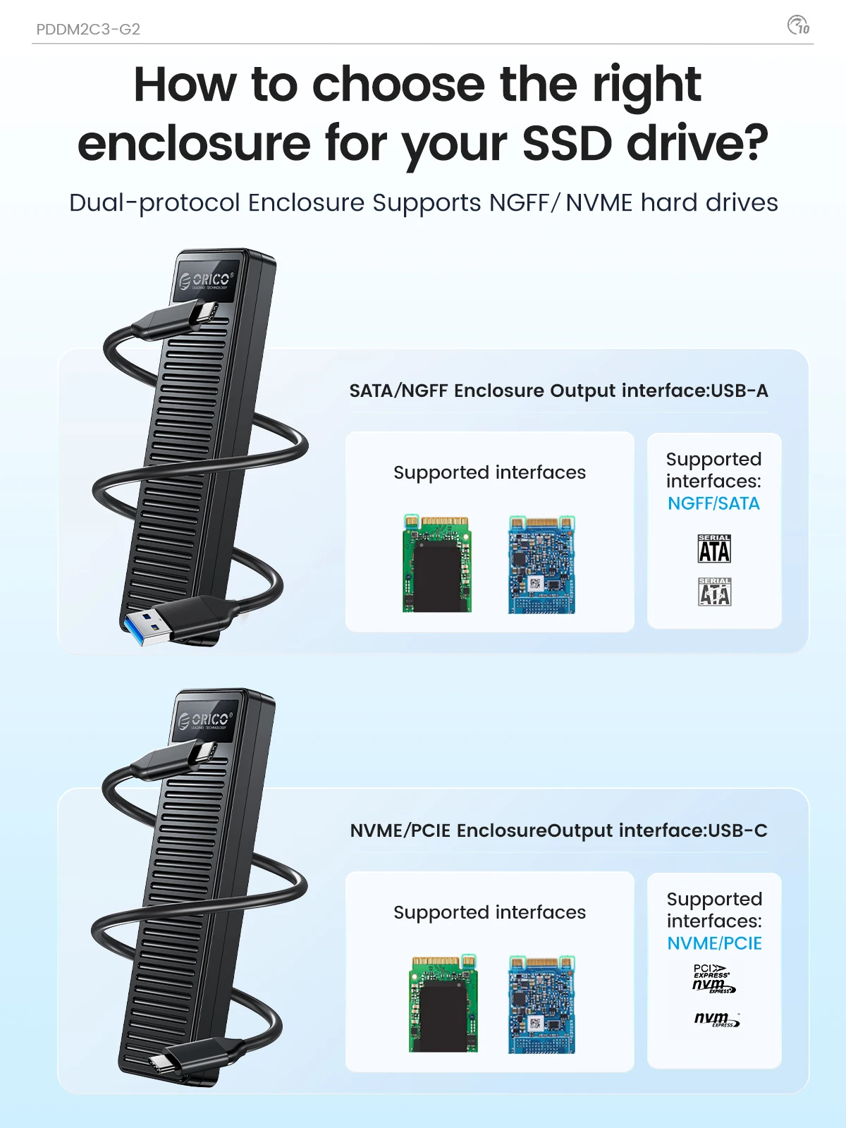 ORICO M.2 NVMe SSD Enclosure 10Gbps USB 3.2 Gen2 Case Box Simple Design Tool-free Support UASP for NVMe SATA SSD Gamers