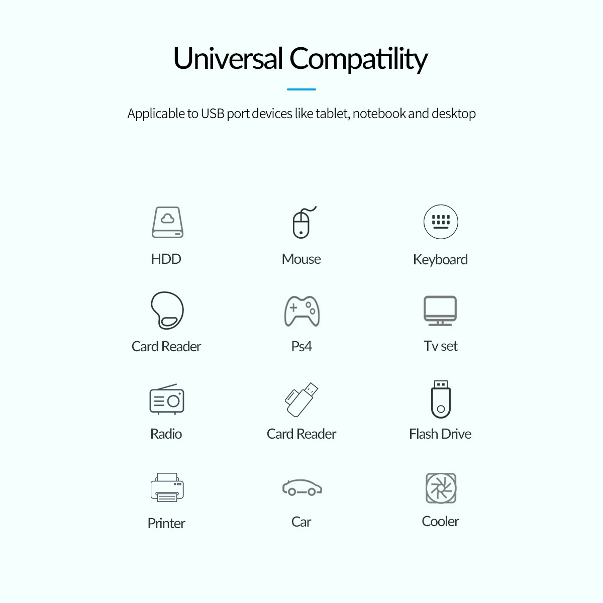- Applicable to USB port devices like tablet, notebook, and desktop