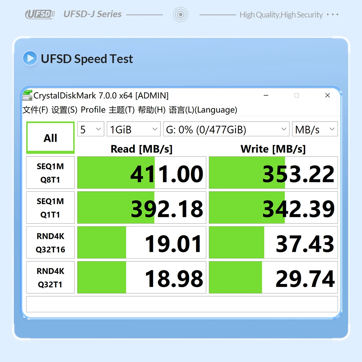 Using the USB3.2 Gen1 high speed transmission protocol, High-speed USB3.2 Gen1 Performance of Read Speed Max 411MB/s, Write speed up to 350MB/s.With write speeds of up to 15X faster than standard USB 2.0 drives , you can transfer 1 GB File in less than 3 seconds .