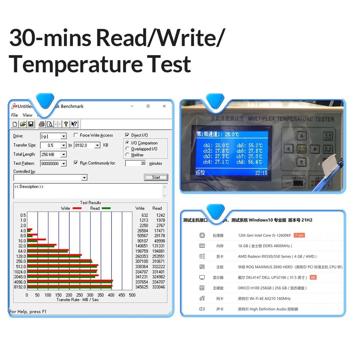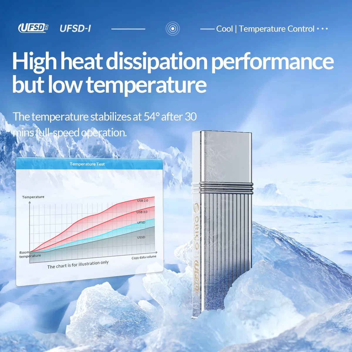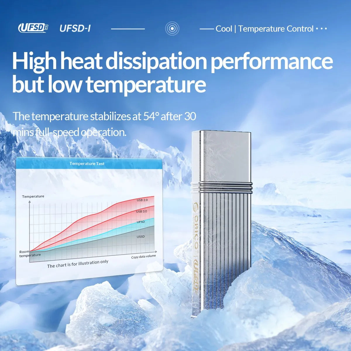 UFSD USB3.2 Gen1 Flash Drive 30 minutes continuous full speed reading in the test environment of ORICO Laboratory,Temperature Display 54°C