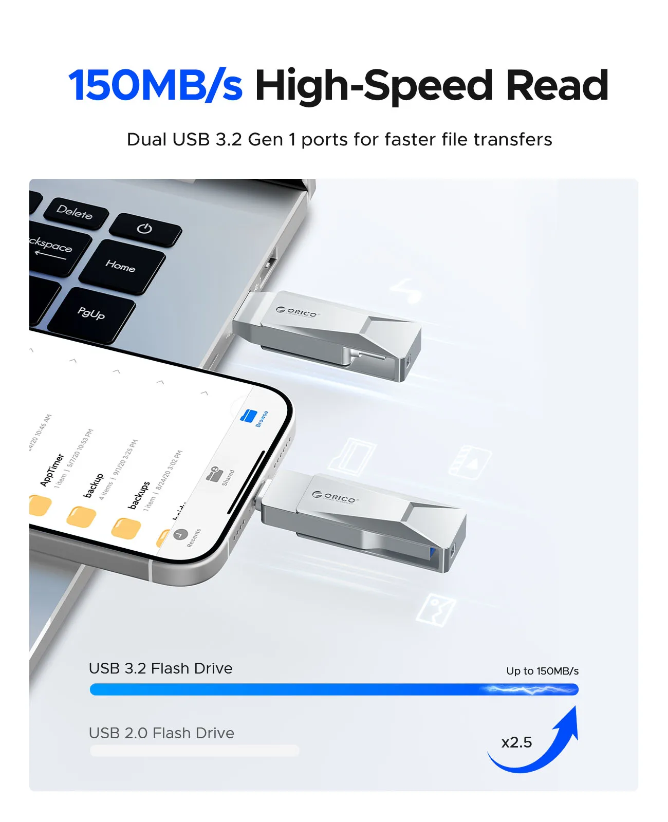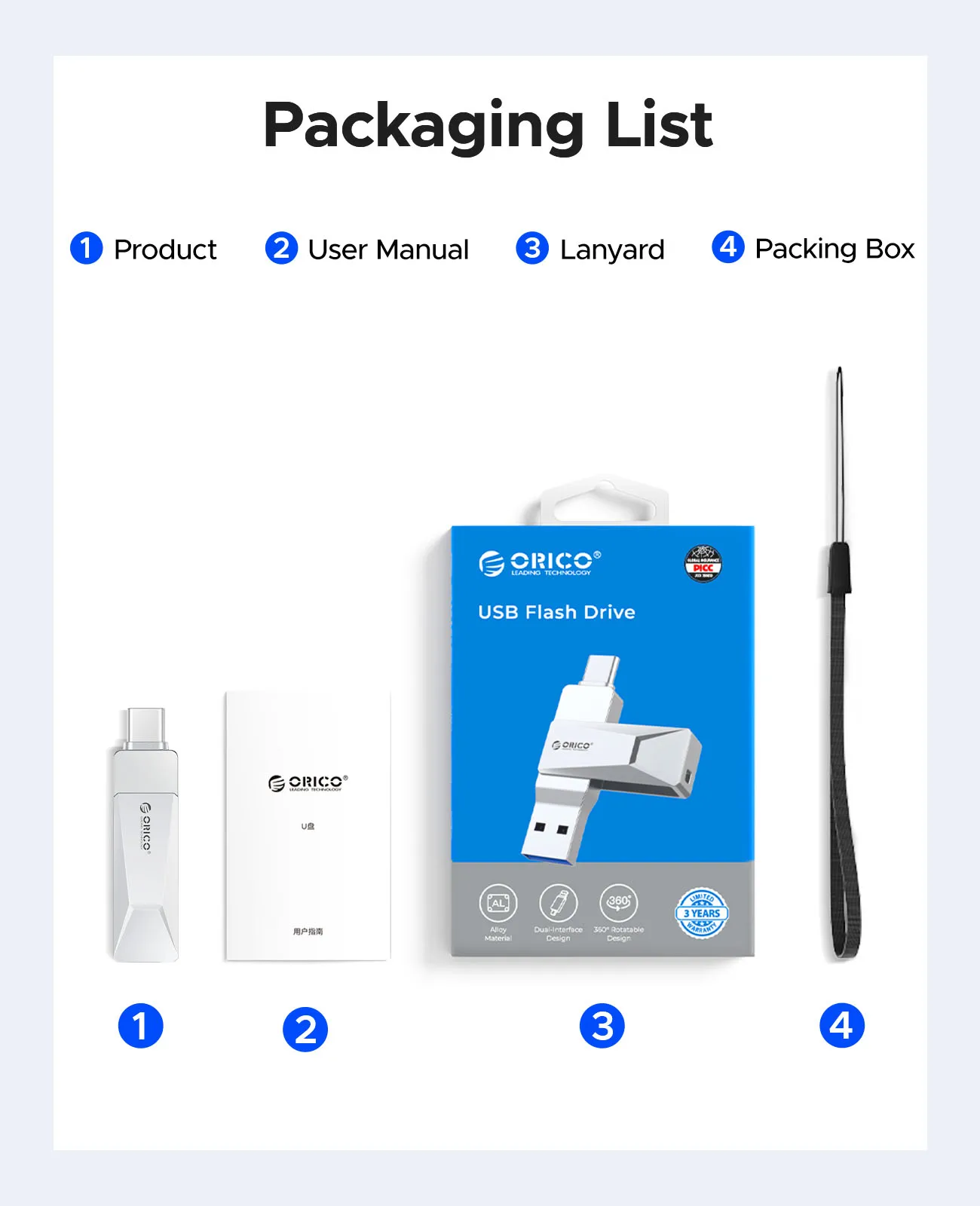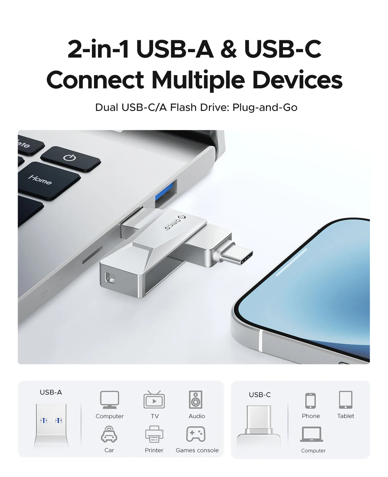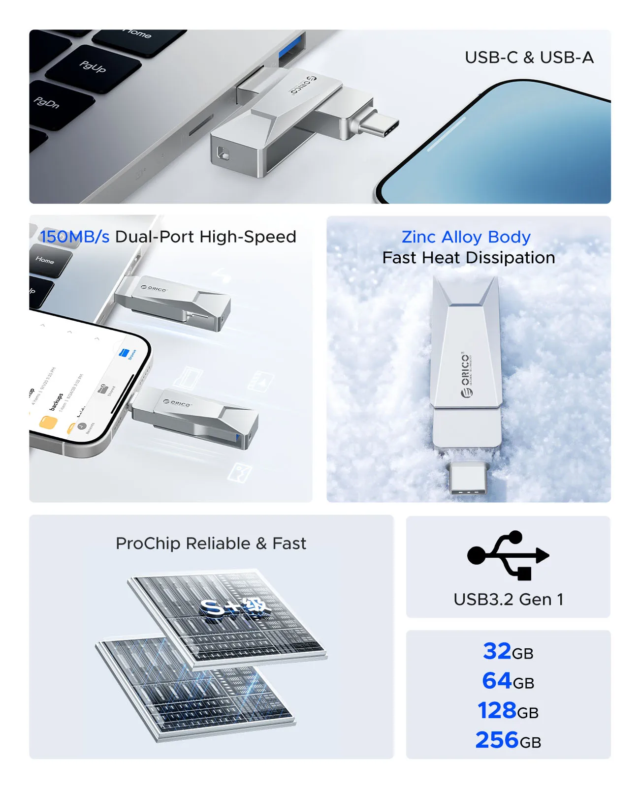 ORICO USB C Flash Drive Dual USB 3.2 Flash Drive Type C + USB A Portable Type-C Flash Drive 2-in-1 USB-C Thumb Drive