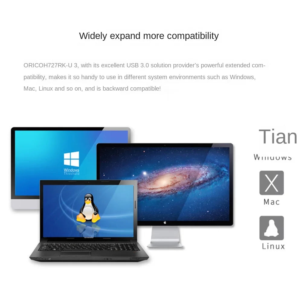 Incorporating the new version of VIA's performance solution, combined with ORICO's years of expanded PCB R&D experience, ORICO H727RK has excellent low power consumption, bandwidth allocation, and power management capabilities. Using USB PHY technology, it can maintain the full speed of each interface at 5Gbps under different topology channels. operation, and maintain signal integrity, and the interfaces do not interfere with each other.