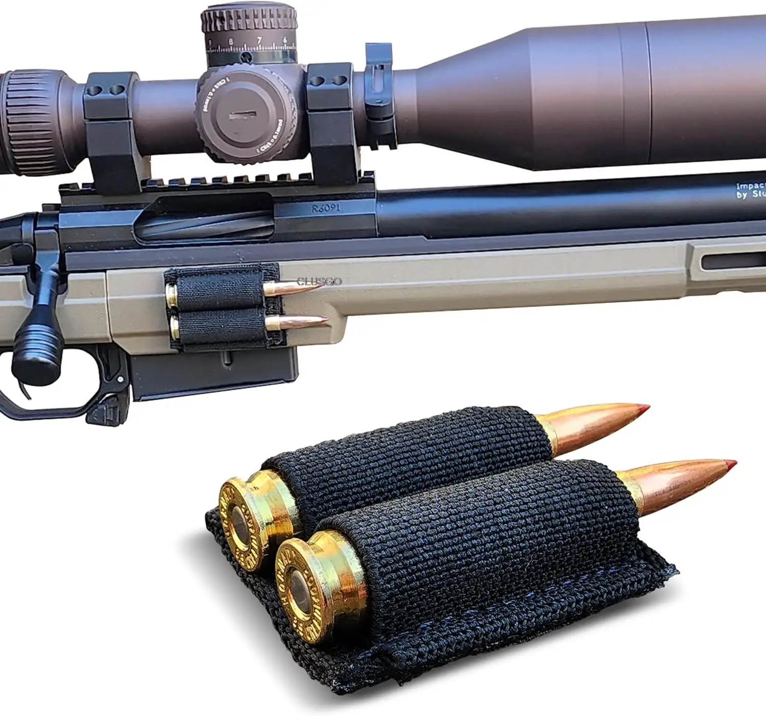 This 2 round ammo holder is one of the must-have rifle accessories. The convenient rifle stock location of this bullet holder can be a real match saver and one of the top shooting range accessories