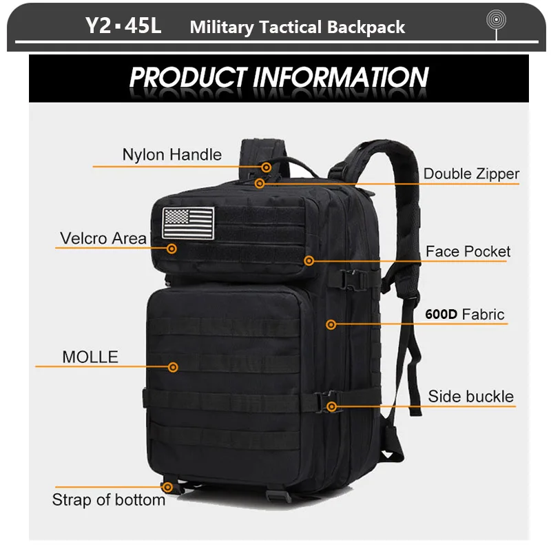 Tactical Backpack 3 Day Assault Pack Molle Bag 38/45L Large Outdoor Waterproof Hiking Camping Travel 600D Rucksack Men Fishing