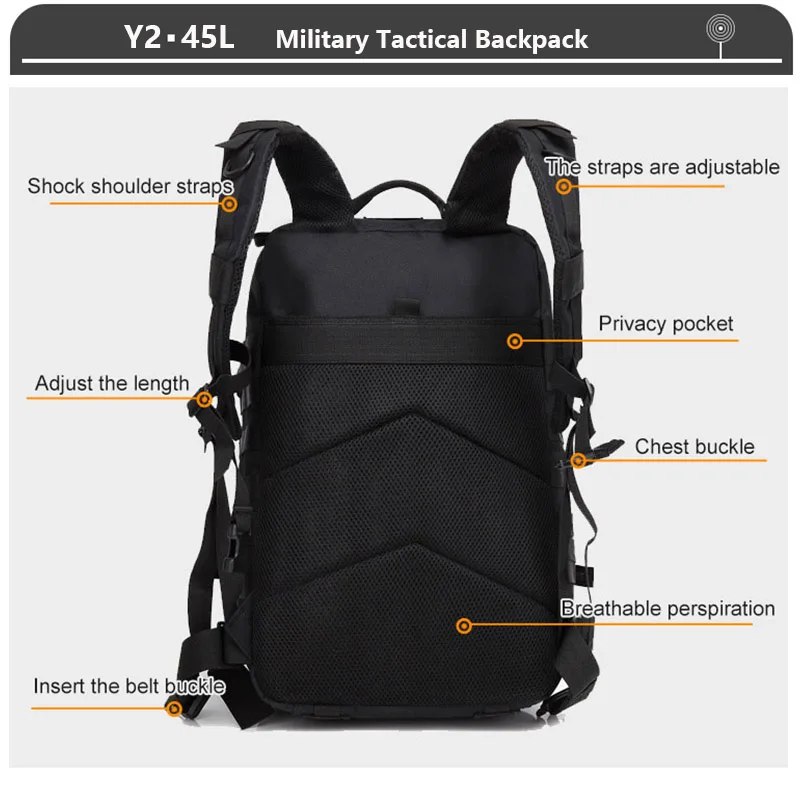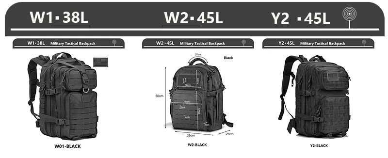 Tactical backpack size approx.:13*20*11/33*50.5*28CM (W*H*D),Capacity: About 45L; backpack is made of high density fabric--durable and water-resistant