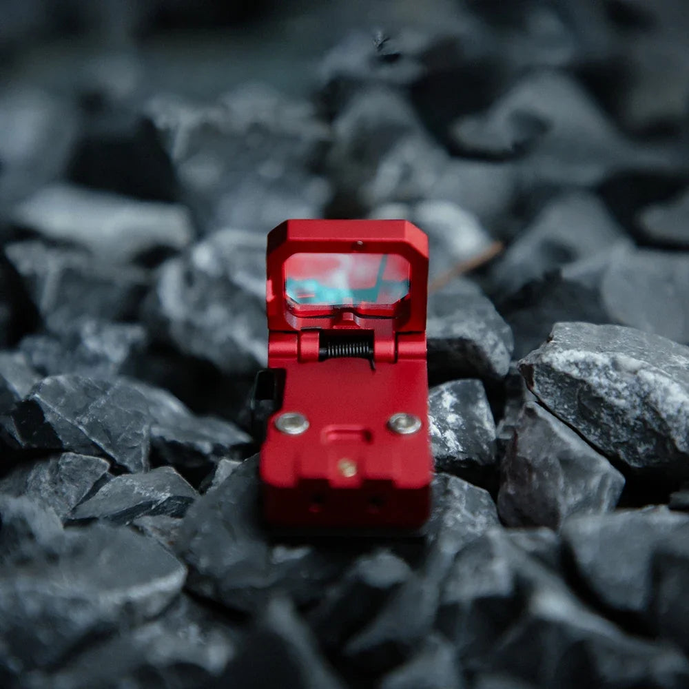 The FlipDot folding Red dot reflex lens (22mm X 16mm) folds down flat when not in use. With a push of a button the FlipDot lens flips up and automatically turns on. The 3 MOA Red dot is fully adjustable for windage and elevation. Folding the lens down turns the optic off.