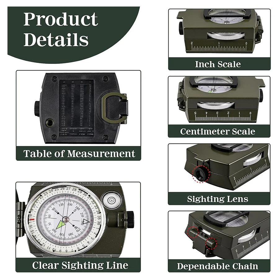 4. Multi functional military compass. Bubble level, tripod connection, slope chart, inch and centimeter scales, adjustable vertical lens prism, window with aiming line.