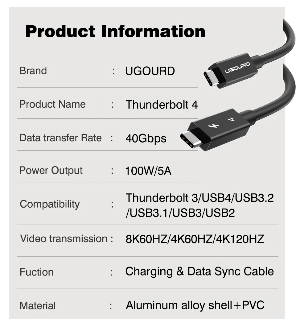 UGOURD 0.2m- 2m Thunderbolt 4 coaxial cable USB4 type c to type c 40Gbps PD 100W Fast charging Cable for egpu iPhone MacBook Air