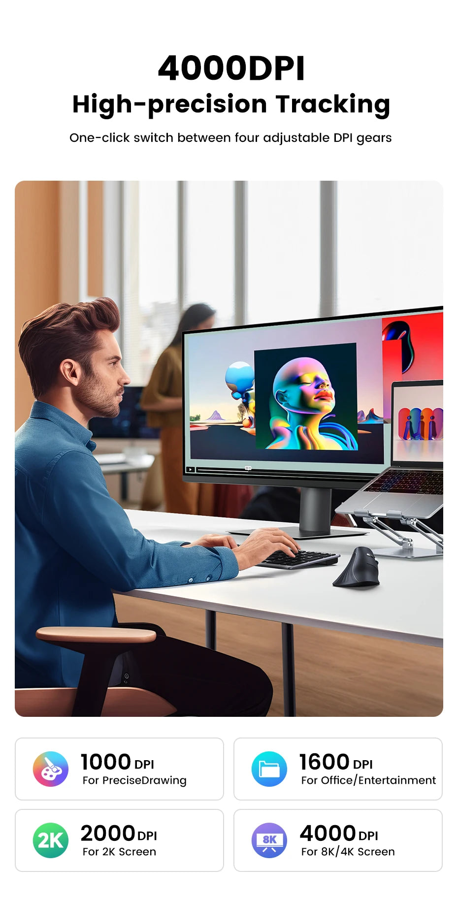 UGREEN Vertical Mouse Wireless Bluetooth5.0 2.4G Ergonomic 4000DPI 6 Mute Buttons for MacBook Tablet Laptops Computer PC Mice