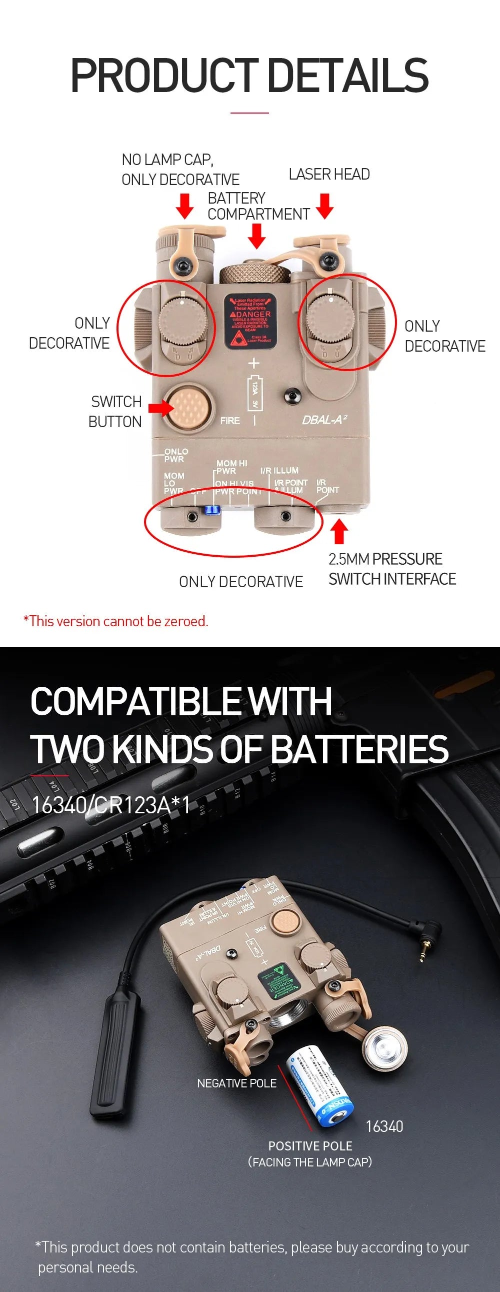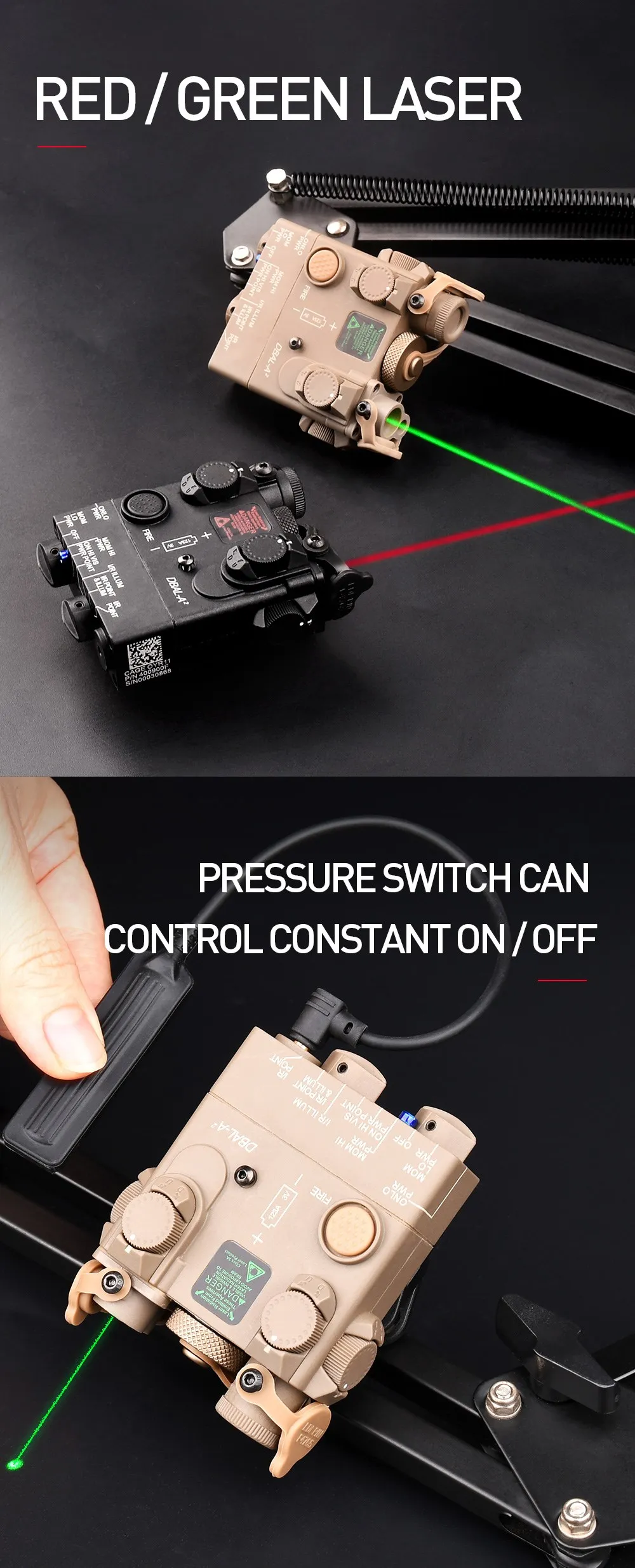 Brand:WADSN Model Number:WDX039 WDX040 Product Name:Airsoft Tactical DBAL-A2 Red /Green Dot Laser Sight(NO IR light) Color:Black,Dark Earth Material:Nylon Plastic Weight:155 Net Weight Functions1:Contstant-On Battery:1x CR123A Or 1x 16340 (not included) Battery life:Red Laser 50h,Green Laser 3.5H Laser wavelength:Red Laser 635nm Green Laser 532nm Rail Type:Fit 20mm picatinny Rail Note: Without IR & White Light Function