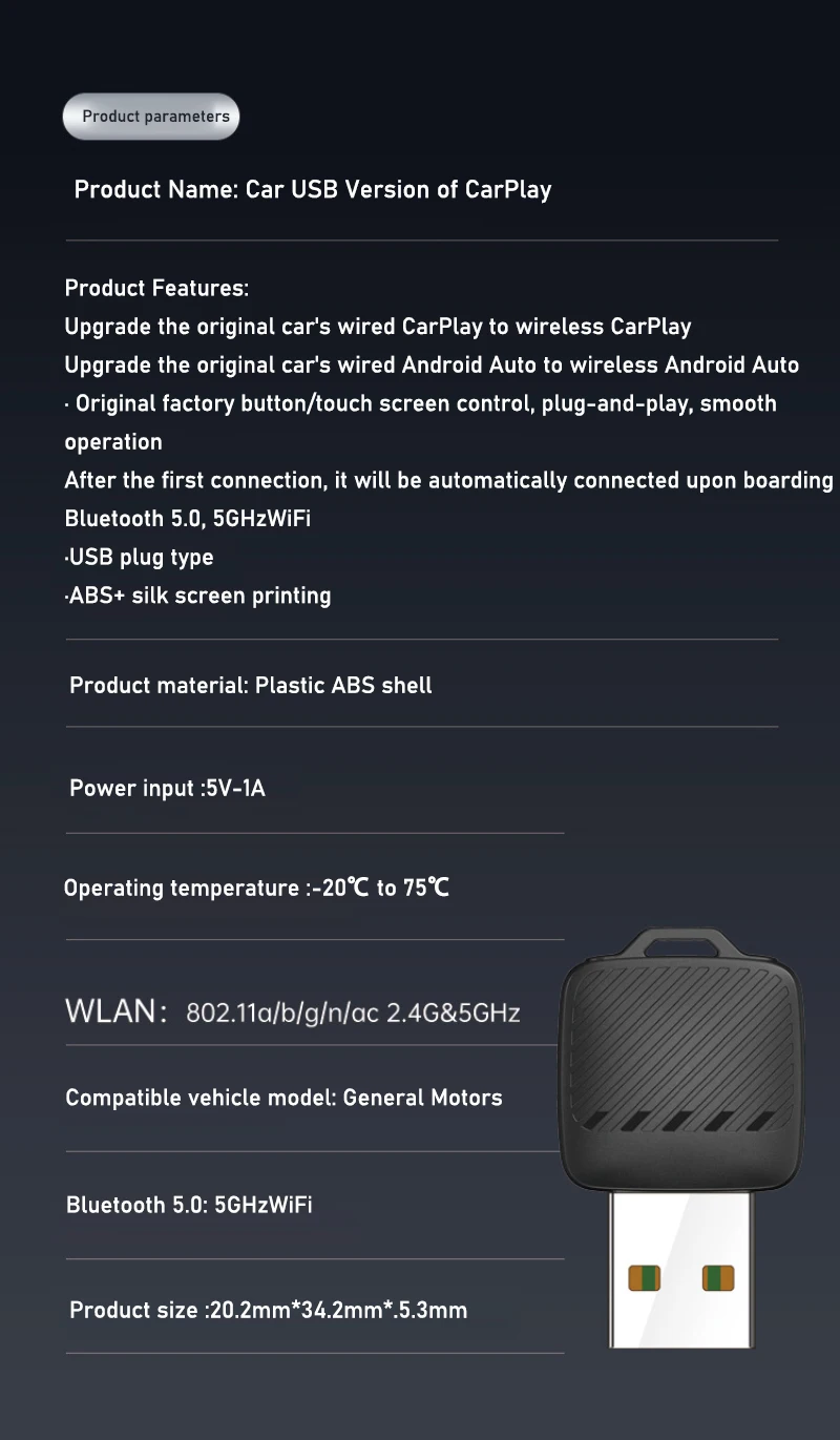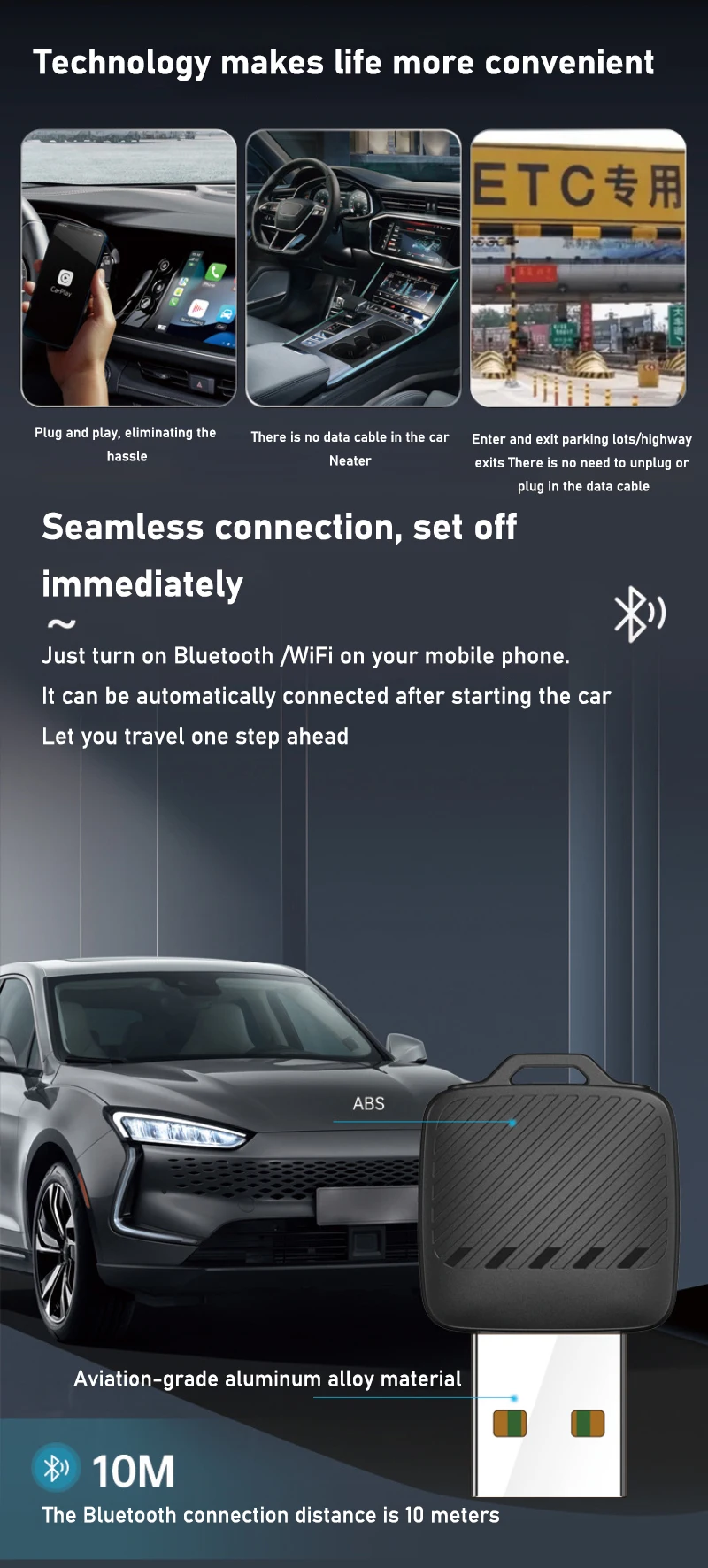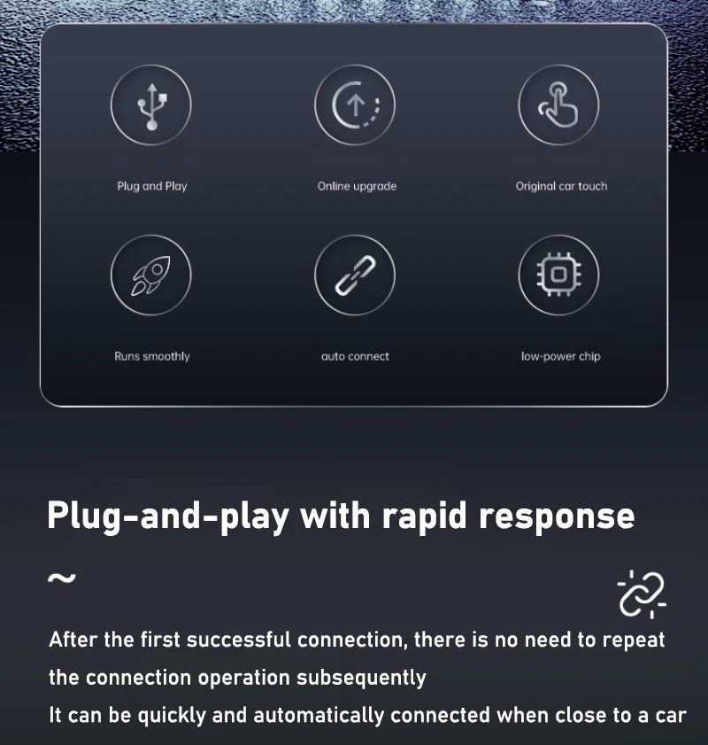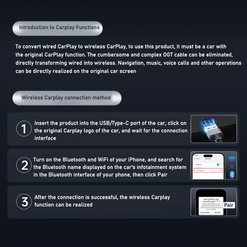 The function of this product is to convert the original wired Carplay/Android Auto into wireless Carplay/Android Auto.