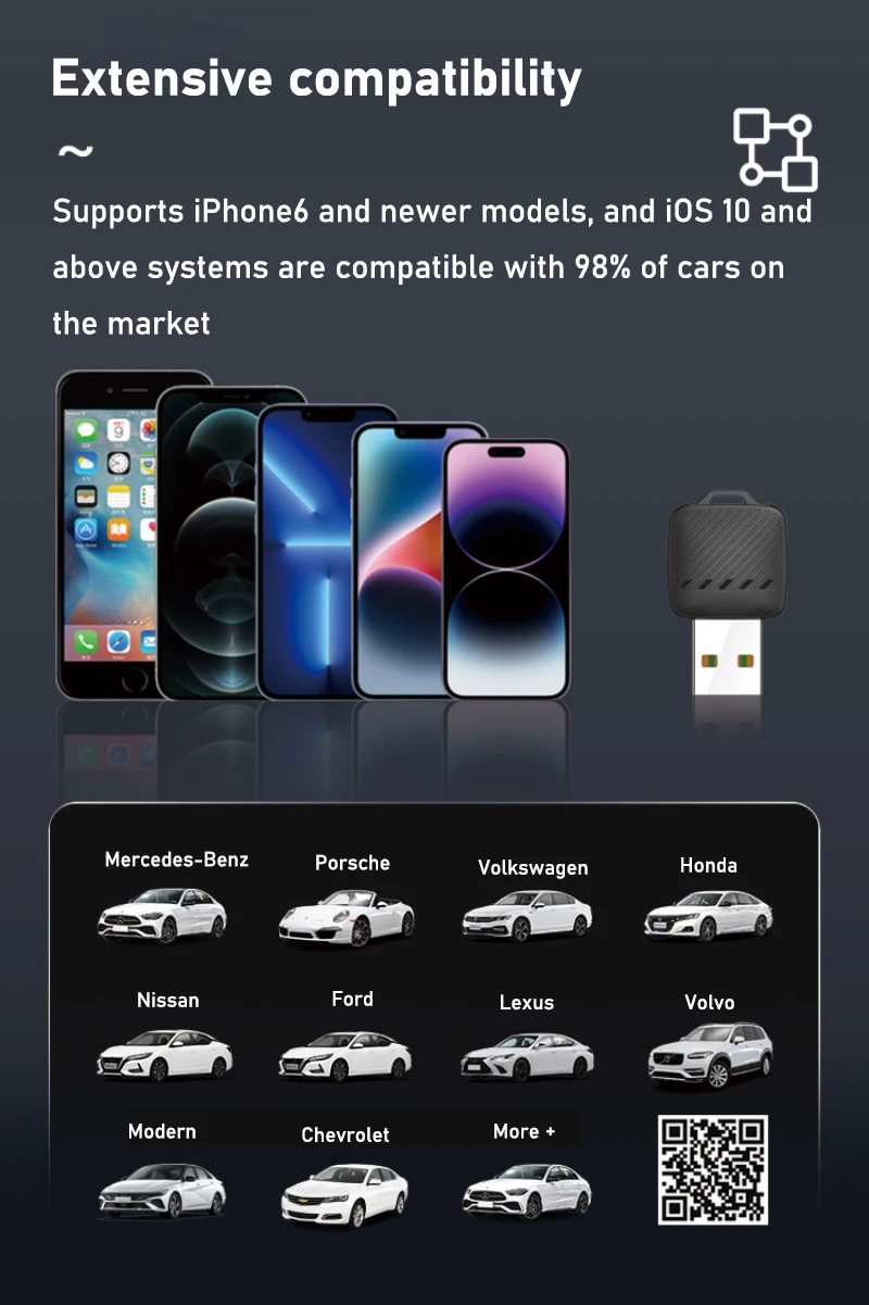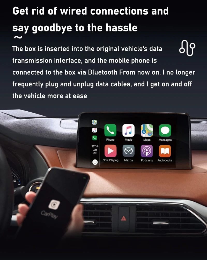 1. Wired to wireless CarPlay adapter, say Goodbye to wires. USB plug-and-play installation, stable and fast, No need to remove OEM radio.