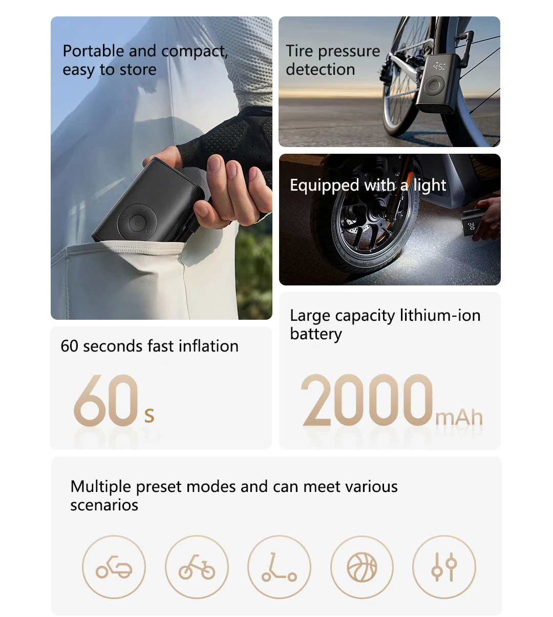 Xiaomi Mijia 2025 New Portable Air Pump 2000mAh 240g 150psi Electric Air Compressor Tire Pressure Detection Multitool Inflator